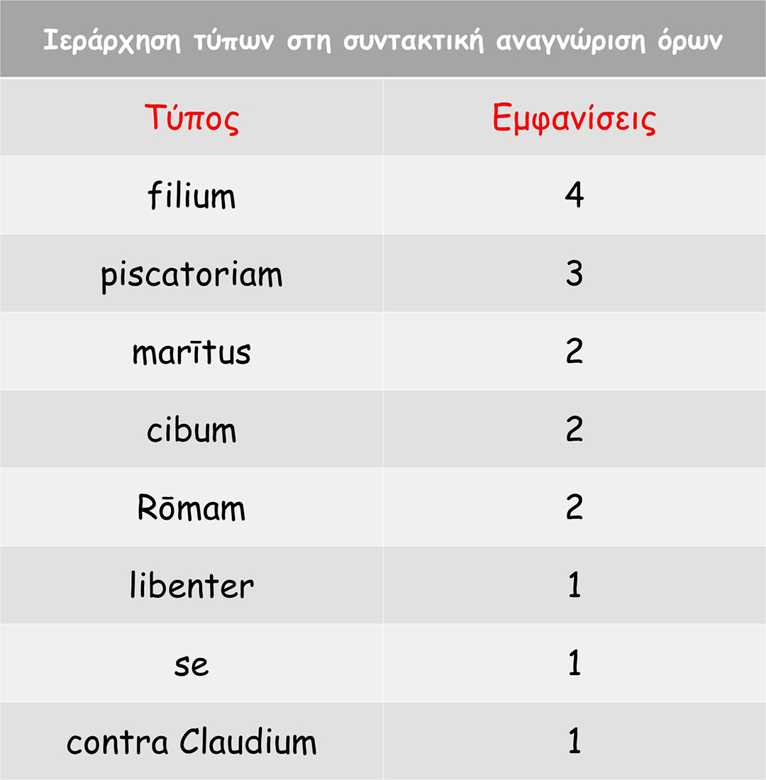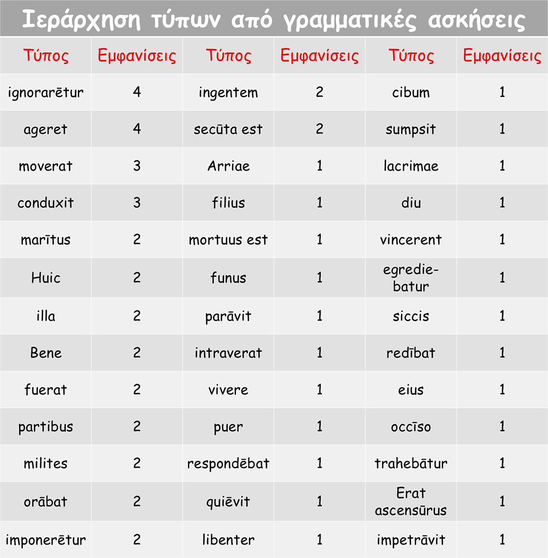 Στους επόμενους δύο πίνακες έχουμε ιεραρχήσει ολόκληρο το λεξιλόγιο του κειμένου που αξιοποιήθηκε στις γραμματικές ασκήσεις και στη συντακτική αναγνώριση όρων.