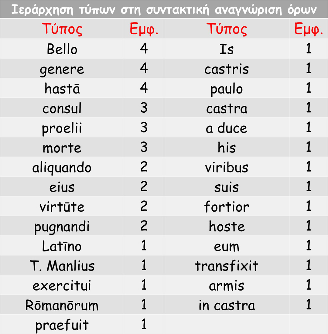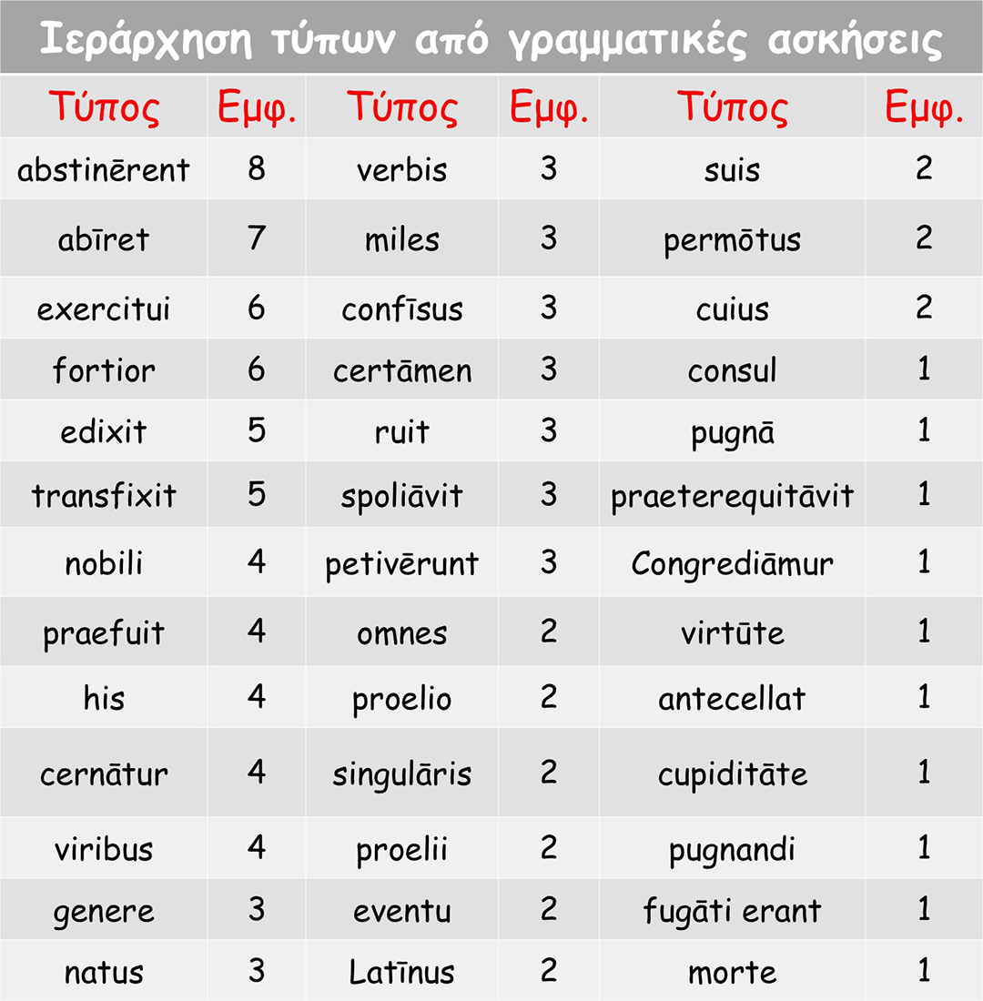 Στους πίνακες βλέπετε ιεραρχημένους όλους τους τύπους που έχουν ζητηθεί στις γραμματικές ασκήσεις και στη συντακτική αναγνώριση όρων.