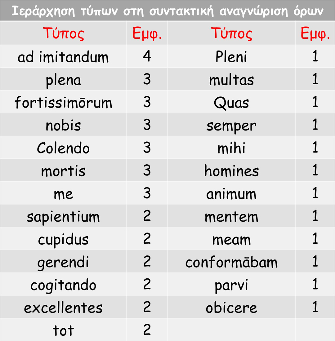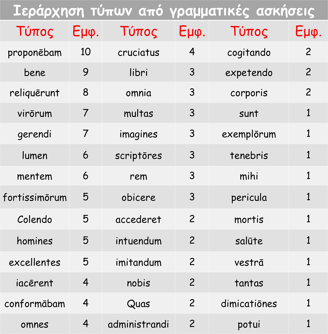 Στους πίνακες βλέπετε ιεραρχημένους όλους τους τύπους που έχουν ζητηθεί στις γραμματικές ασκήσεις και στη συντακτική αναγνώριση όρων.
