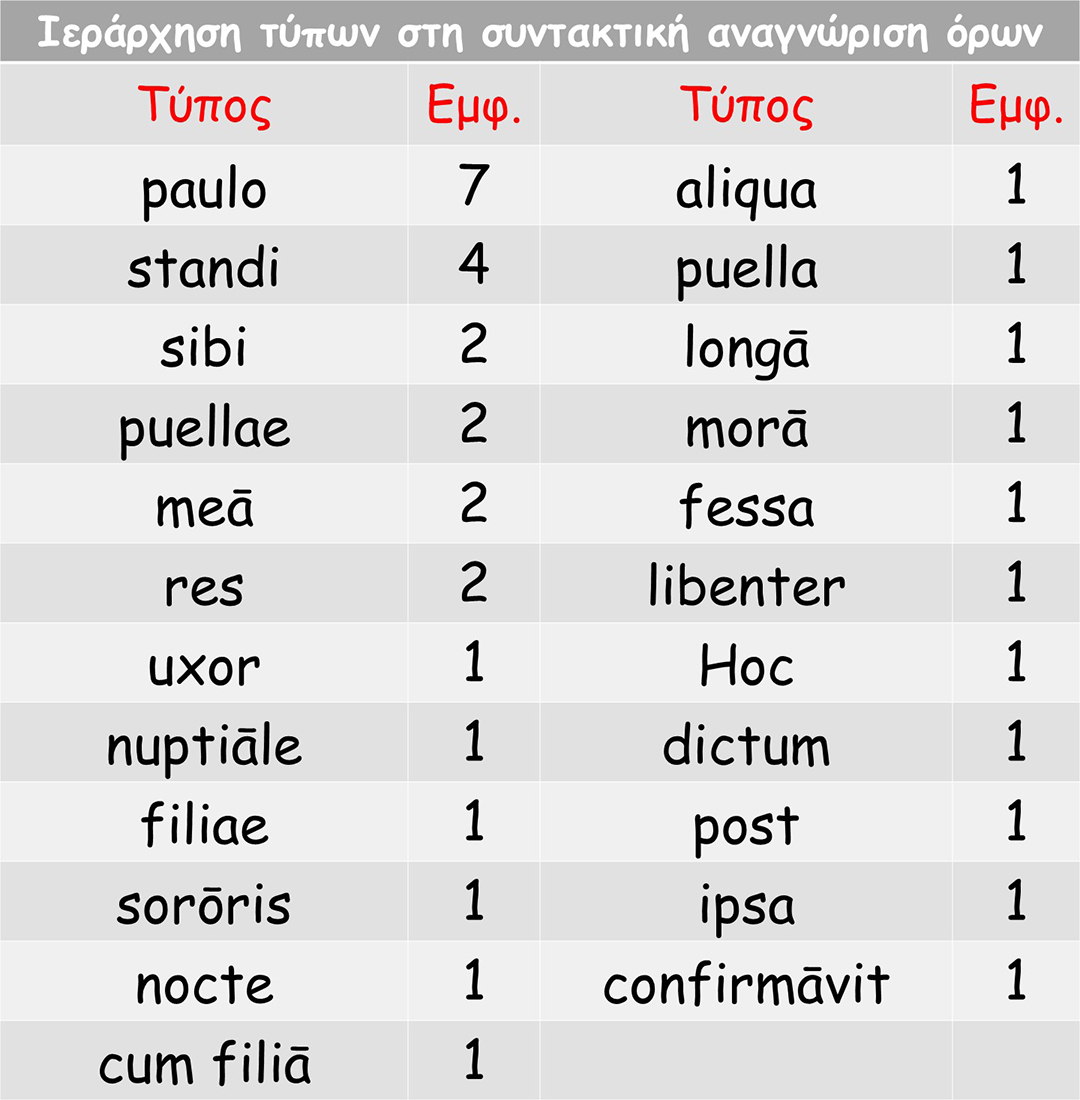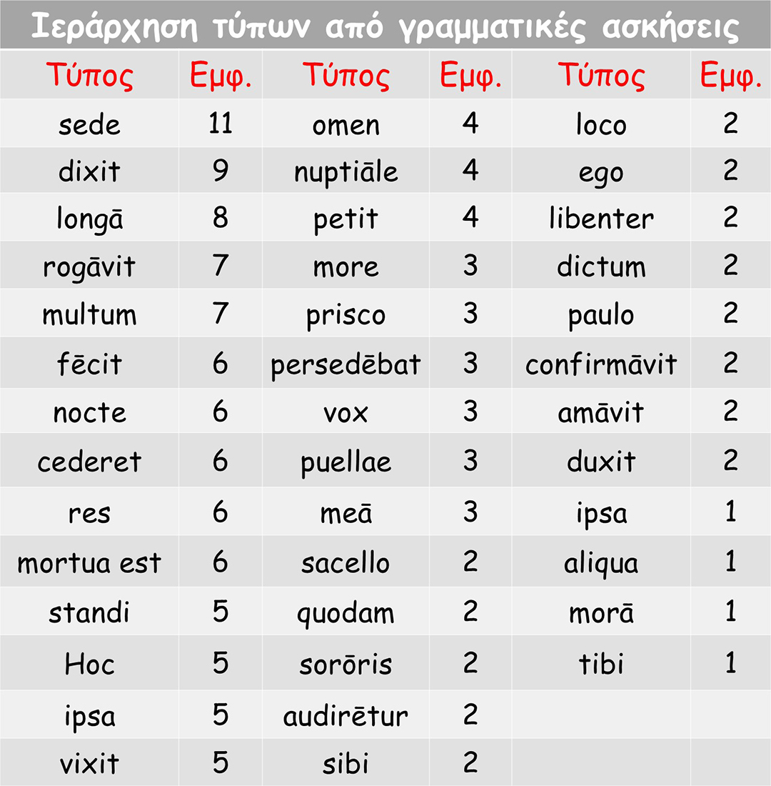 Στους πίνακες δίνουμε ιεραρχημένους όλους τους τύπους που έχουν ζητηθεί στις γραμματικές ασκήσεις και στη συντακτική αναγνώριση όρων.