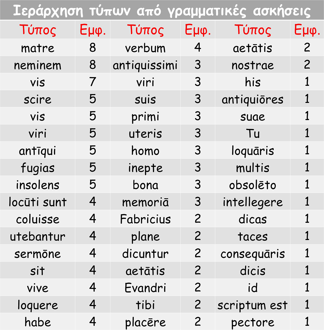 Στους πίνακες δίνουμε ιεραρχημένους όλους τους τύπους που έχουν ζητήθηκαν στις γραμματικές ασκήσεις και στη συντακτική αναγνώριση όρων.