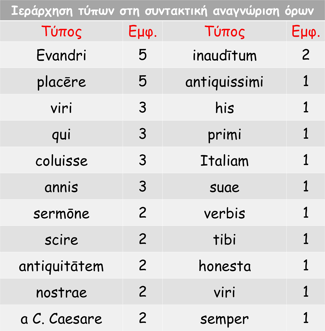 Στις δευτερεύουσες προτάσεις προσέχουμε την υποθετική παραβολική πρόταση «proinde quasi cum matre Evandri nunc loquāris» (3 εξεταστικά φύλλα), την αιτιολογική πρόταση αντικειμενικής αιτιολογίας «quod neminem scire atque intellegere vis» (3 εξεταστικά φύλλα) και την πλάγια ερωτηματική πρόταση «quae dicas» (1 εξεταστικό φύλλο).
