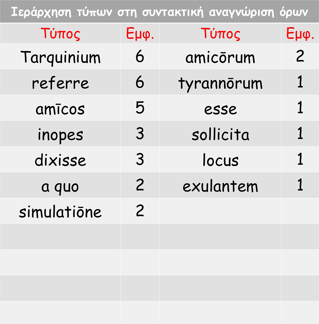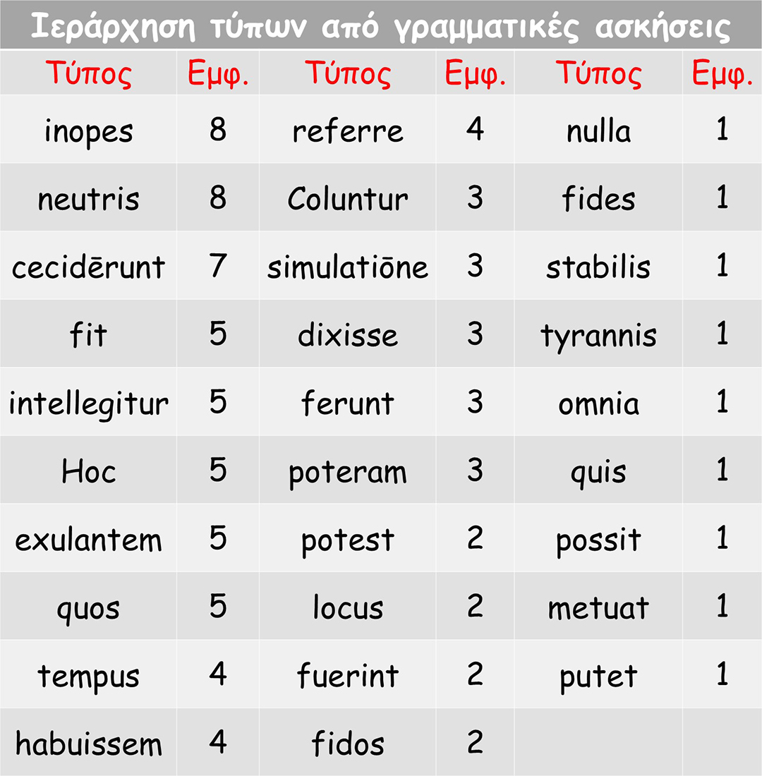 Στους πίνακες δίνουμε τους τύπους που ζητήθηκαν στις γραμματικές ασκήσεις και στη συντακτική αναγνώριση όρων.