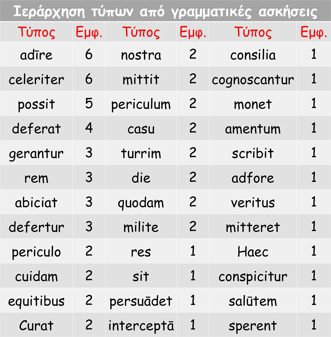 Στους πίνακες δίνουμε τους τύπους που ζητήθηκαν στις γραμματικές ασκήσεις και στη συντακτική αναγνώριση όρων.