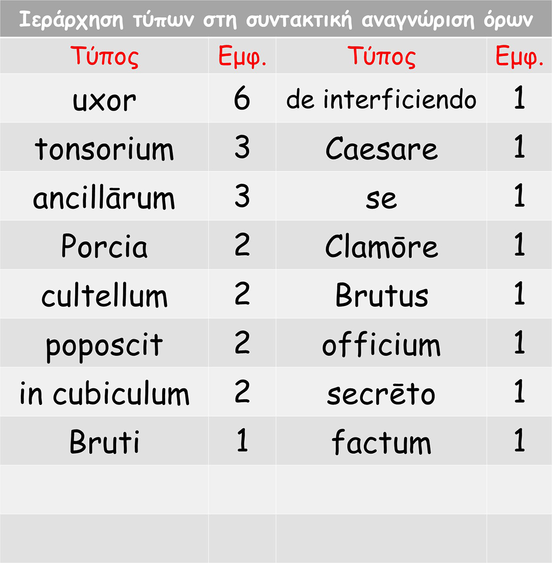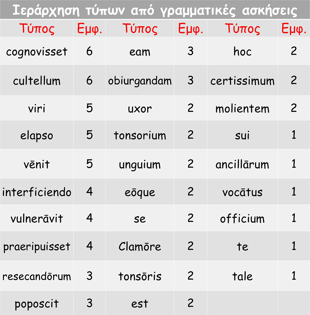 Στους πίνακες δίνουμε τους τύπους που ζητήθηκαν στις γραμματικές ασκήσεις και στη συντακτική αναγνώριση όρων.